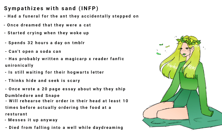 I, the maker of this website, am an INFP 4wing5. Some years ago, I made a serious attempt at writing fiction. I would write these stories, upload them, get feedback, give feedback on their stories, and rewrite my story.