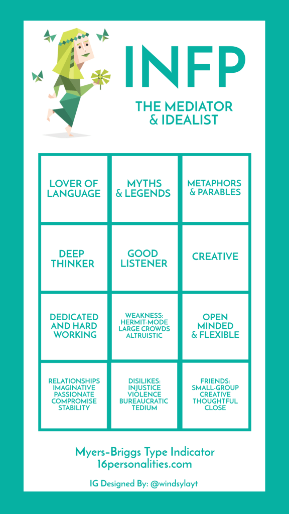 The INFP has a positive and forgiving element that the INFJ would do well with copying. Although sensitive, the INFP is not “small minded” or “petty”.