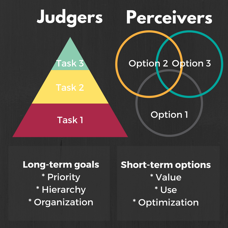 Judgers are much better at labeling and structuring information into something useful, they refuse to be naval gazers. Confusion gives them anxiety while clarity comforts them to the core.