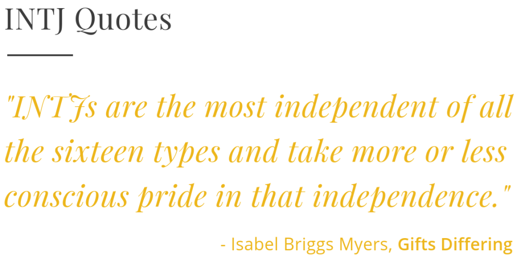 Although INTJs aren’t usually warm or particularly gregarious, they tend to have a self-assured manner with people based on their own security in their intelligence. They relate their ideas with confidence, and once they have arrived at a conclusion they fully expect others to see the wisdom in their perceptions.