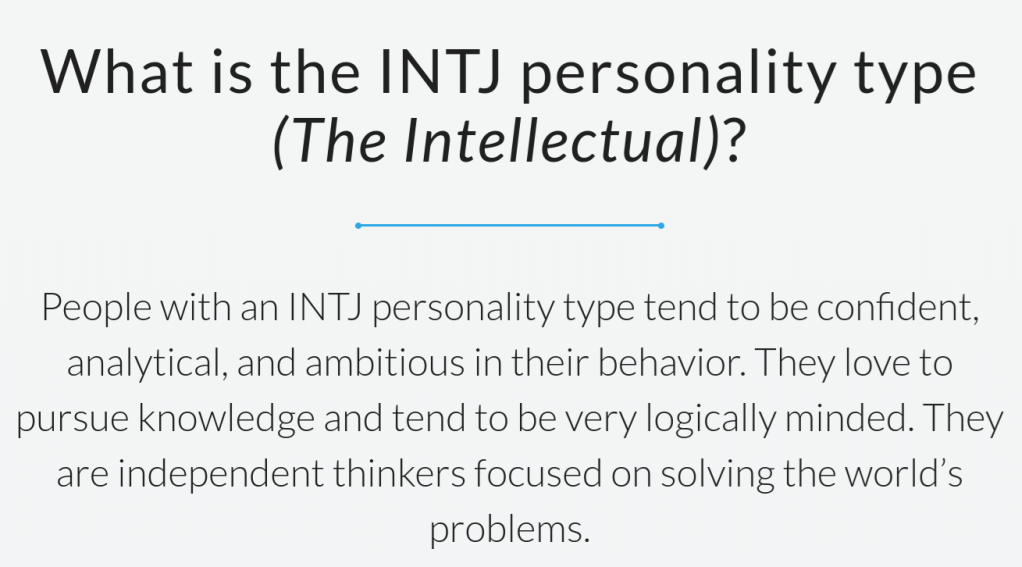 INTJs are analytical problem-solvers, eager to improve systems and processes with their innovative ideas. They have a talent for seeing possibilities for improvement, whether at work, at home, or in themselves.