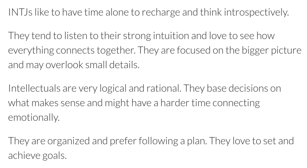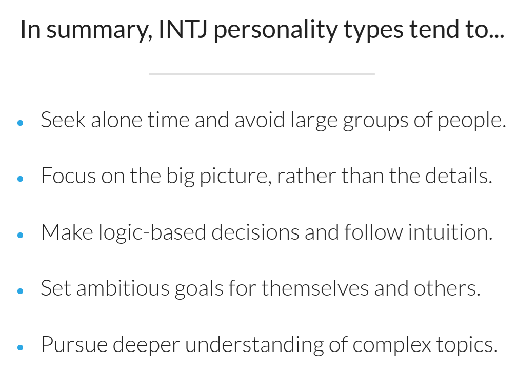 INTJs think critically and clearly, and often have an idea about how to do something more efficiently. They can be blunt in their presentation, and often communicate in terms of the larger strategy, leaving out the details.
