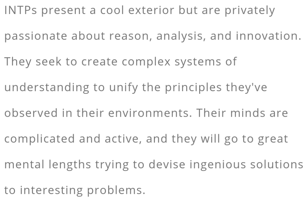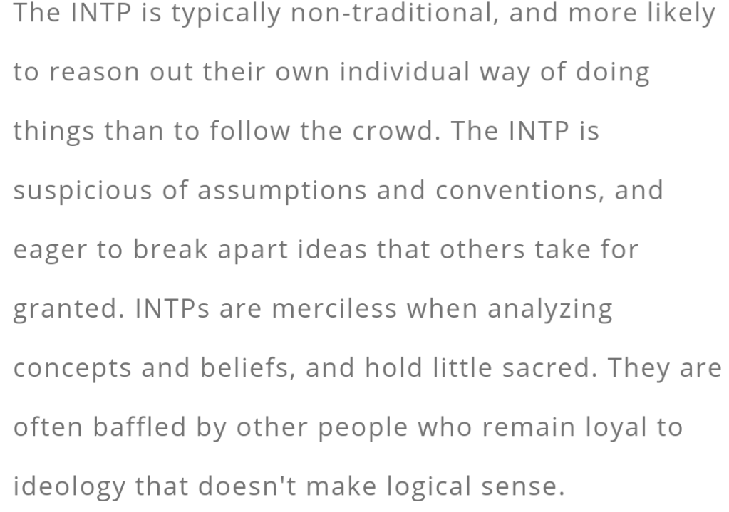 Here are a couple INTJs. The INTP is similar to the INTJ and they are often typed for each other. The INTJ is a little more “direct”, and lacks the soft touch of the artistic INTP. The INTJ is known to be somewhat selfish and non-altruistic, on average.