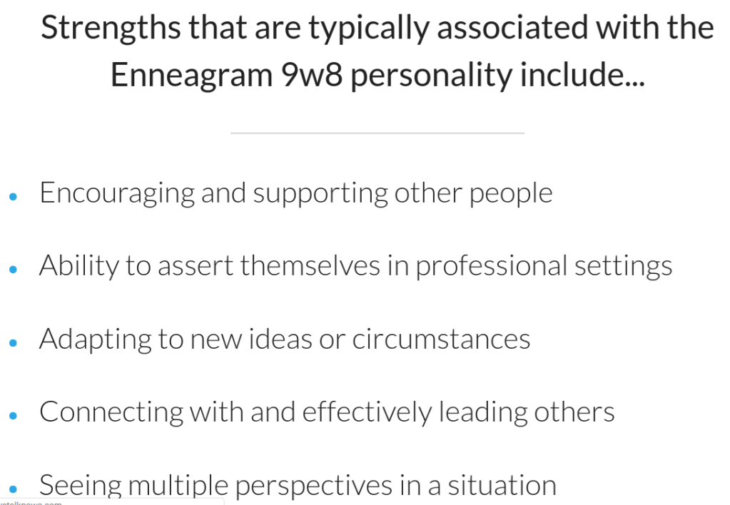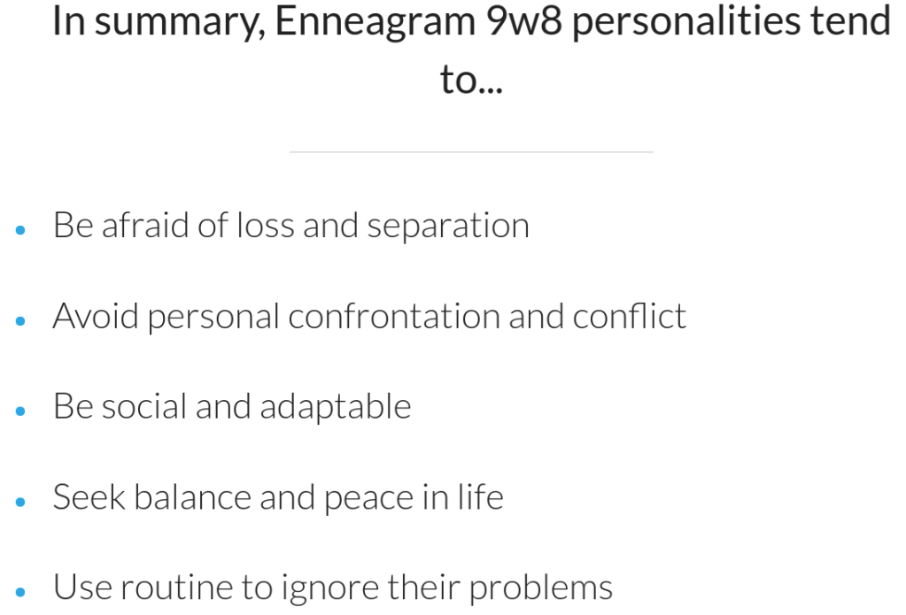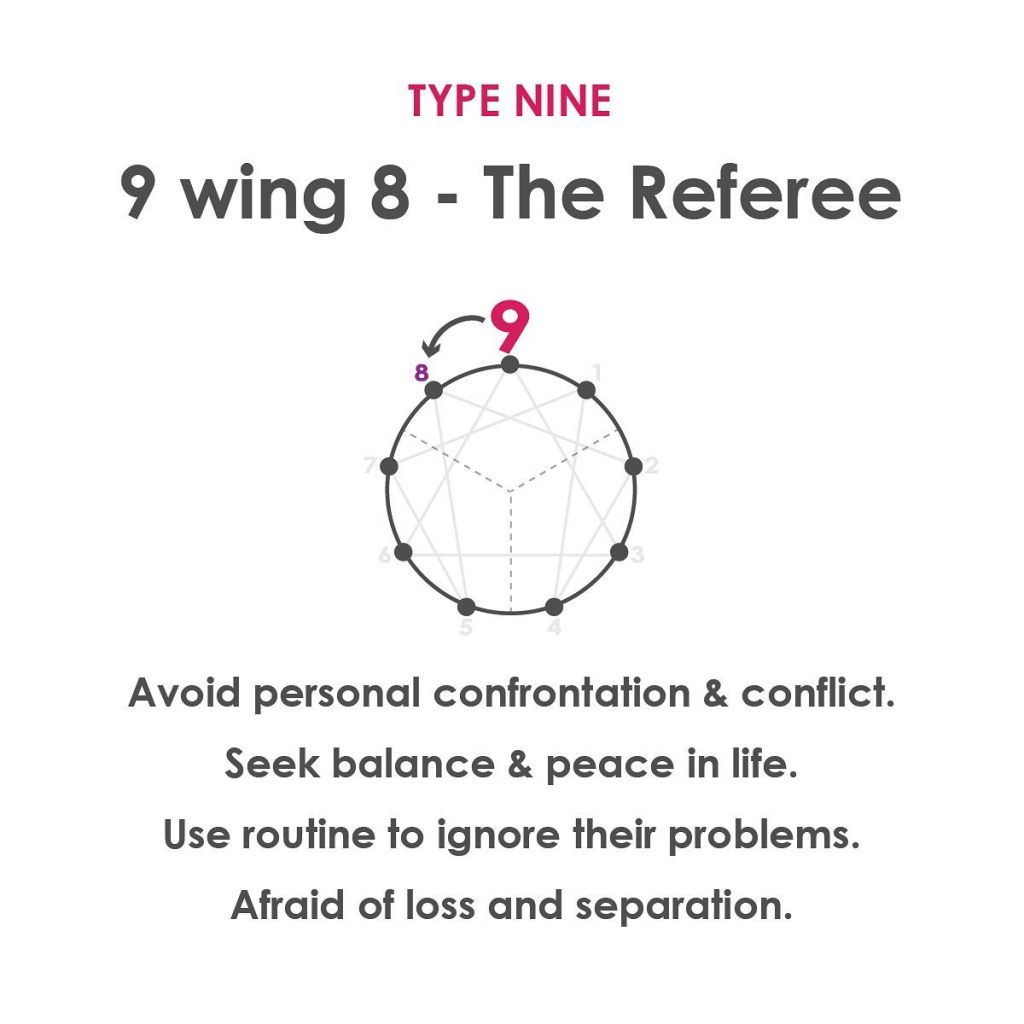 The 9wing8 is very interesting. Because 9s despise confrontation, while the 8 handles confrontation better than any Enneagram type. The default state of the 9 is a calm problem solving state, while the default state of the 8 is being angry.