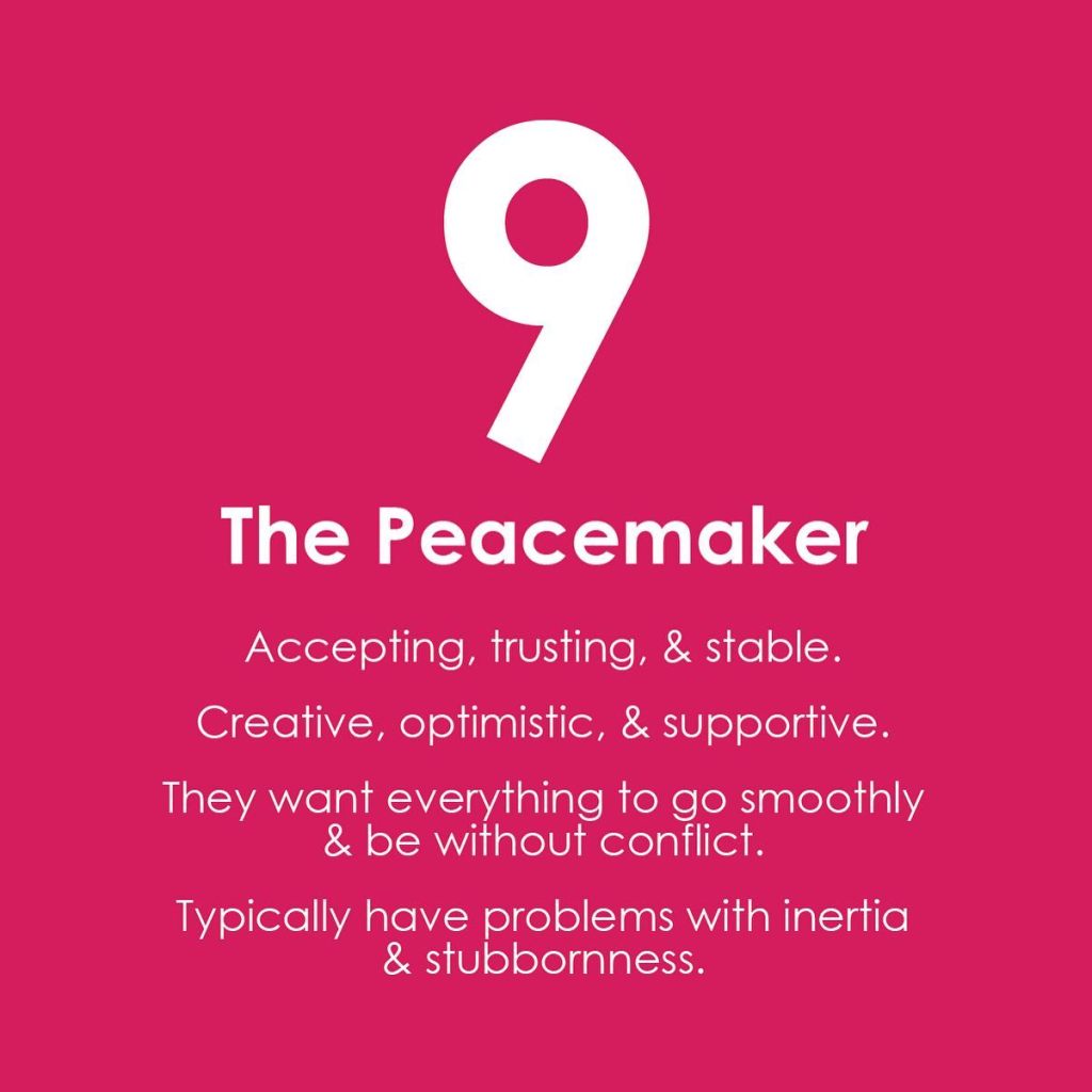 Nines are accepting, trusting, and stable. They are usually creative, optimistic, and supportive, but can also be too willing to go along with others to keep the peace.