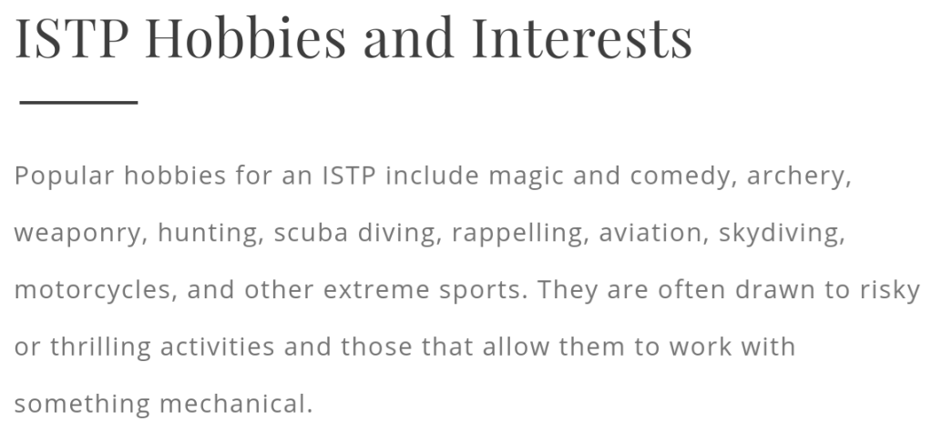 ISTPs are keenly observant people who are experts in the use of their five physical senses. They will make observations like small differences in taste, colour or texture which others may miss, but they won’t say them unless asked.