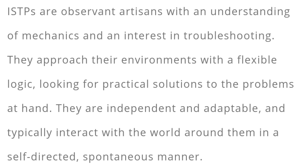 Oh, and well paid! How could I forget! The ISTP is a good talker, and a good writer, but they aren’t MOVED by it, if that makes sense? It doesn’t necessarily rock their boat. Around 80% of pro MMA fighters are ISTPs.